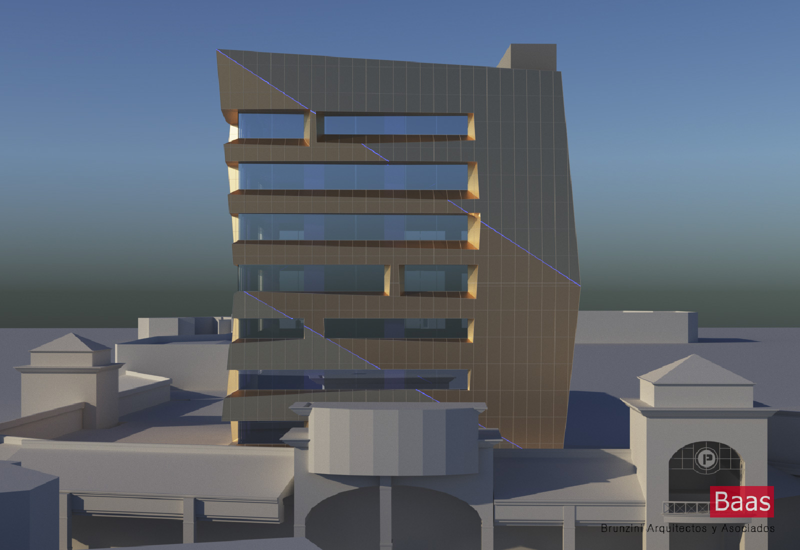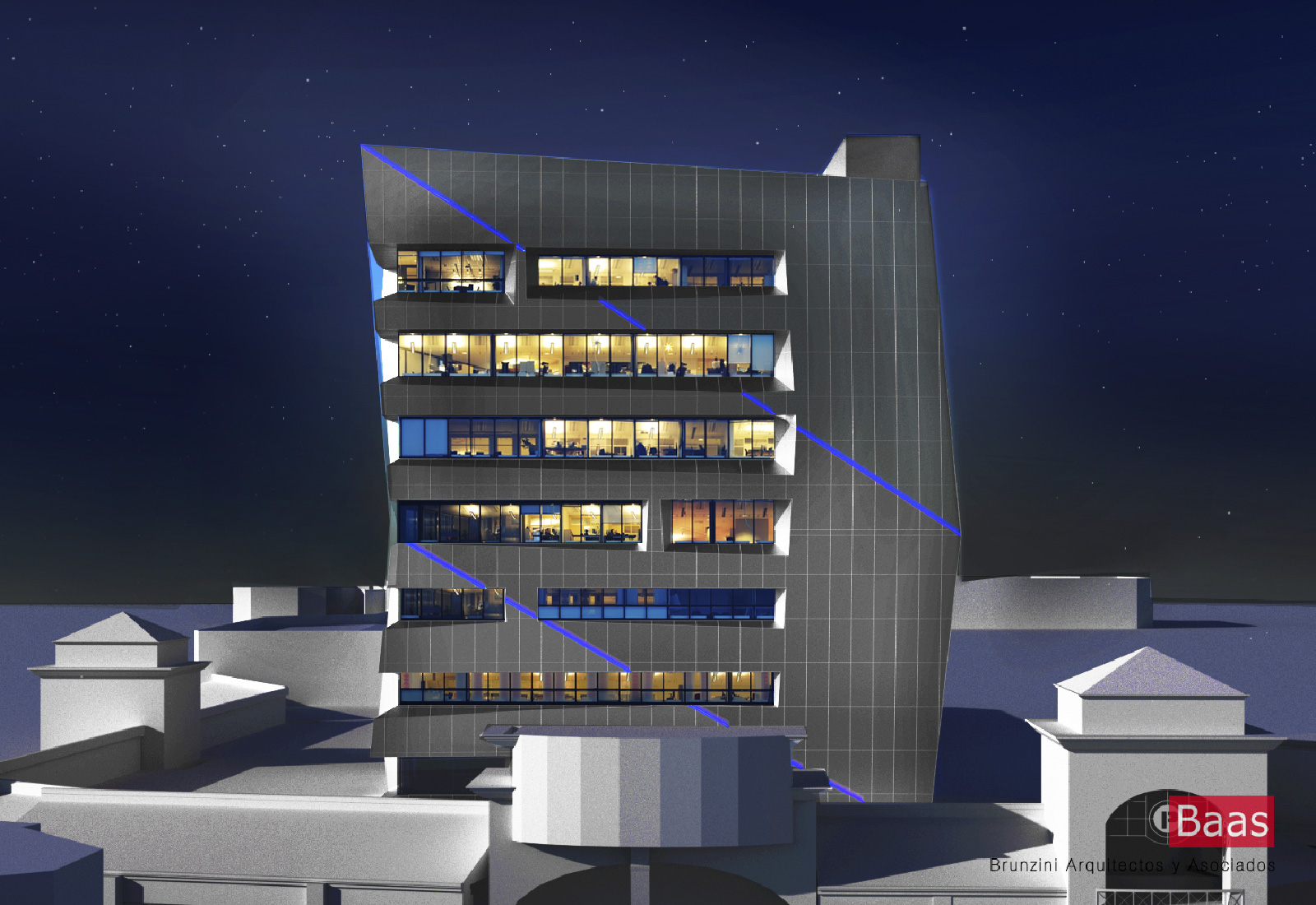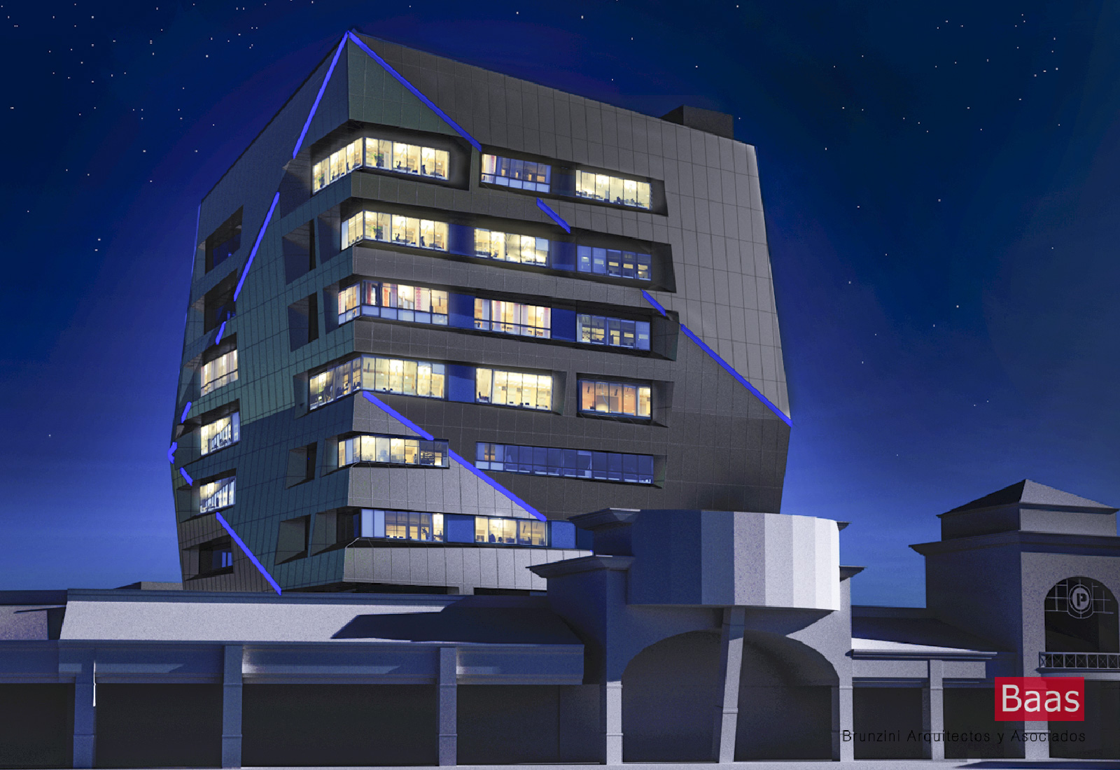 Sobre la base de una estructura de hormigon existente, se priorizo el diseno de su envolvente tipo fachada ventilada, tomando como premisa su ubicacion geografica; hecho condicionante para el tratamiento de la misma, conforme a la orientacion de cada una de las fachadas, resultando en un edificio de imagen dinamica y diferenciada en cada una de sus caras, contribuyendo asi a la reduccion de su consumo energetico.