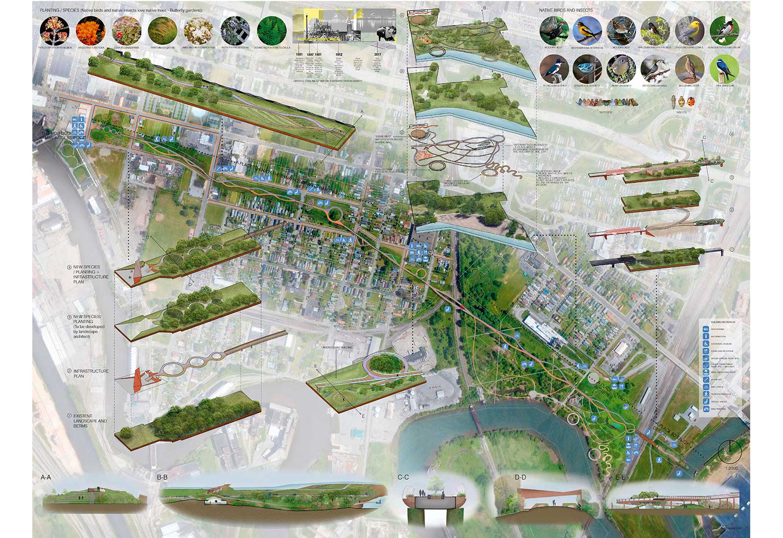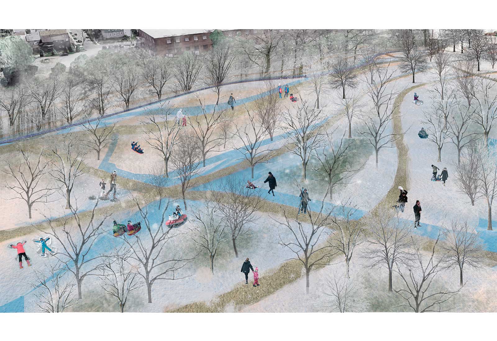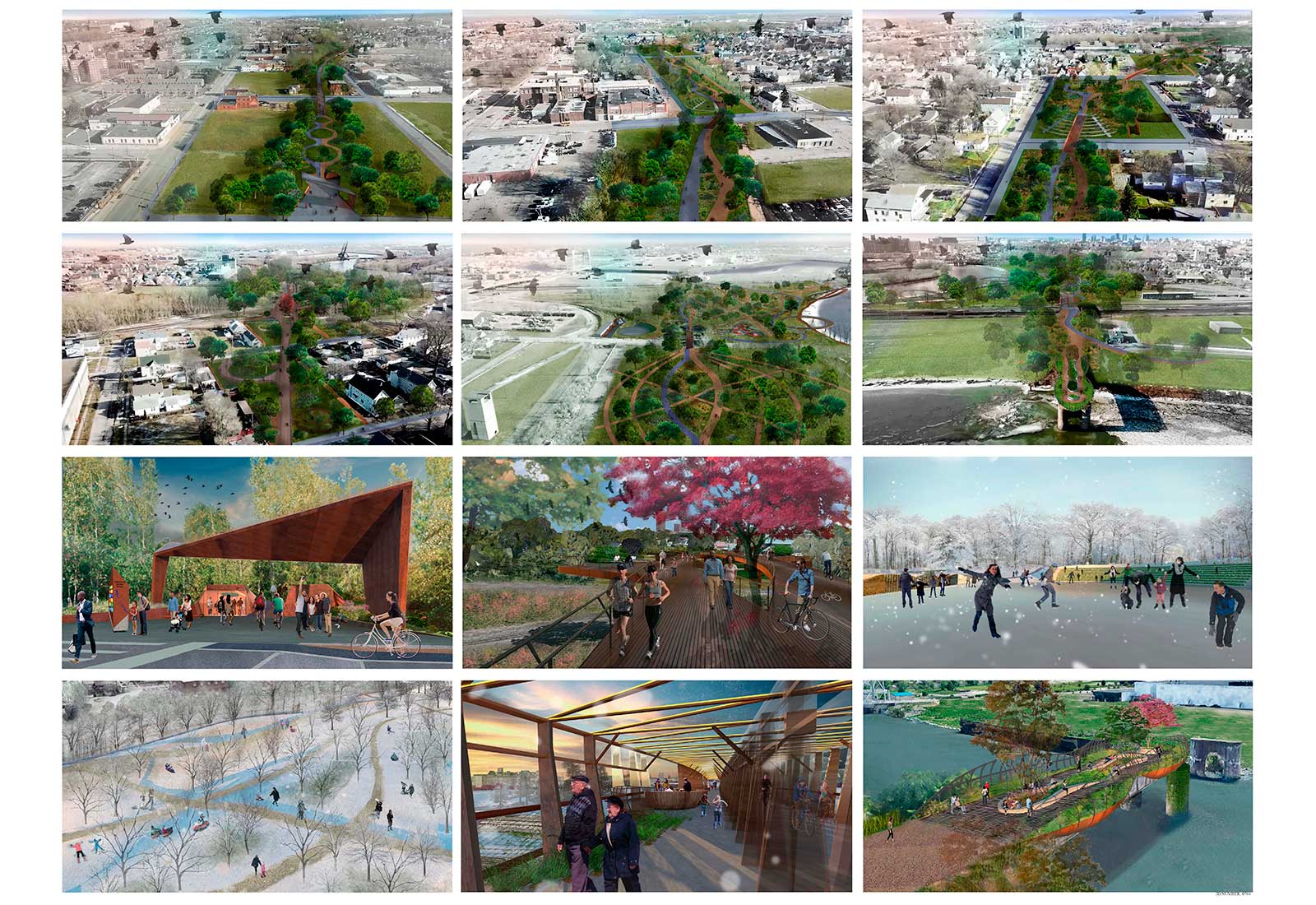 The Buffalo Glow Trail is a linear public park that accentuates the serene nature, vibrant history, and active lifestyle in the City of Light. The trail exists at the intersection of natural and industrial landscapes, allowing the visitor to walk, bike or ski the same path that trains once traveled. The Glow Trails illumination will highlight the landscape at night, with historical information about Buffalos prominence in the spread of hydroelectricity and artificial light. It will be a memorable botanical experience and urban amenity, day and night.